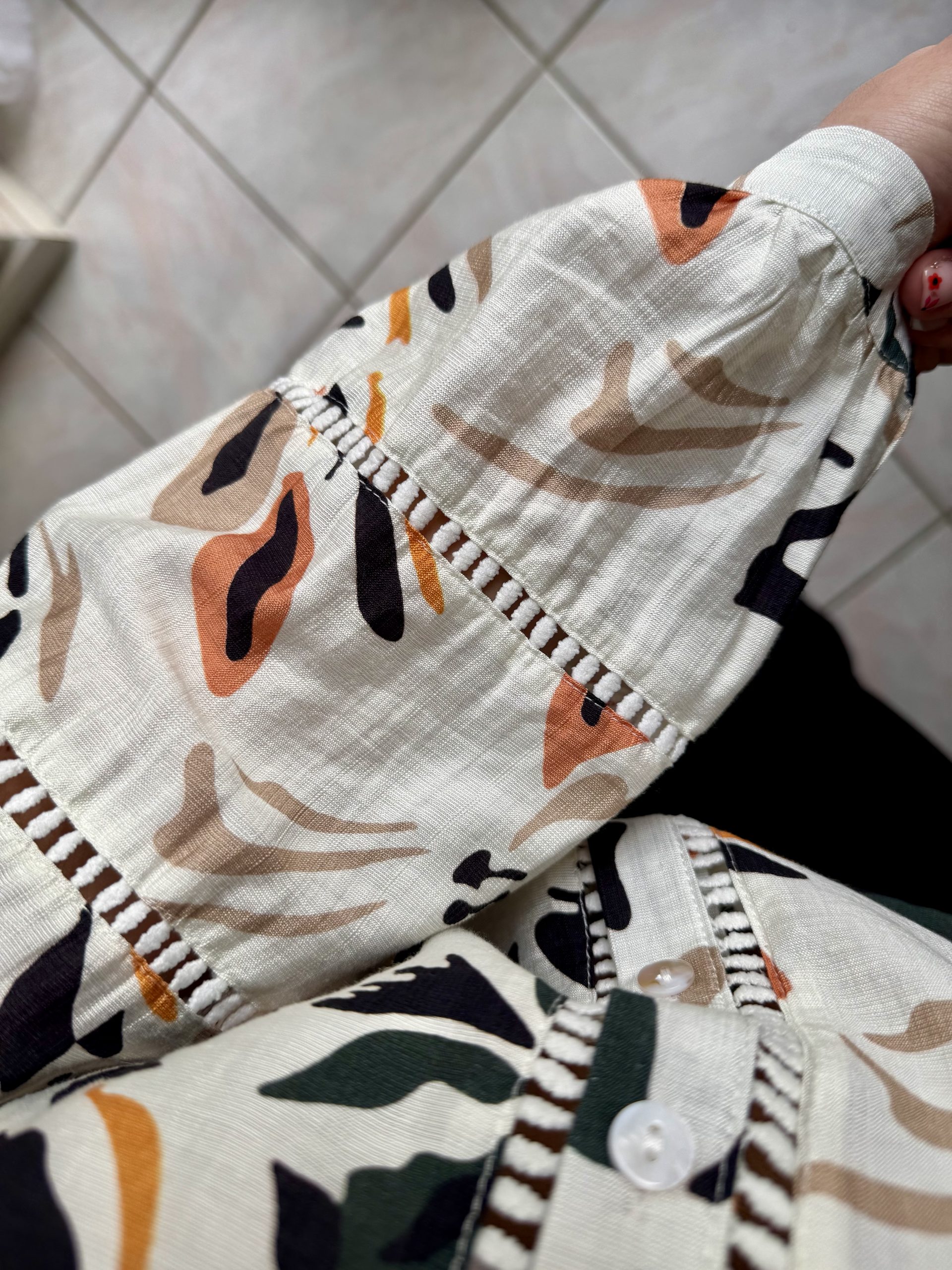 • Détail macramé aux manches, épaules et col