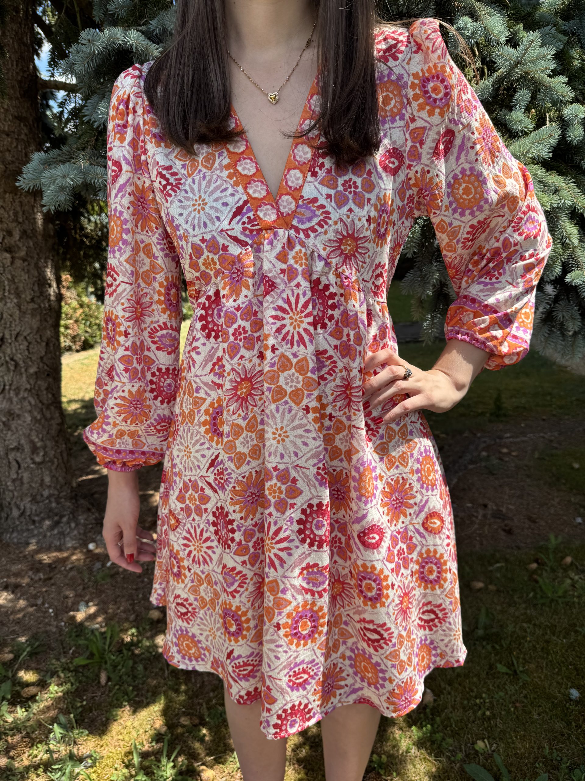 Couleurs : Orange, mauve, bordeau & rose Composition : 80 % viscose, 20 % polyamide   Doublure : 100 % coton Entretien : Lavage à 30°c Guide taille : S : 36 M : 38 L : 40 Julie porte la taille S pour son 36 et mesure 1m71 Mégane porte une taille L pour son 40 et mesure 1m62 Prenez votre taille habituelle.